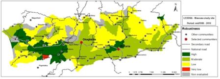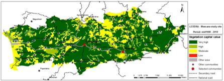 The robustness in natural capital of the area under existing vegetation cover and soil characteristics shows a varying ability to retain the critical function of primary production. The lower part of the valley exhibits moderate to high robustness while the sloping areas are characterized by low robustness.