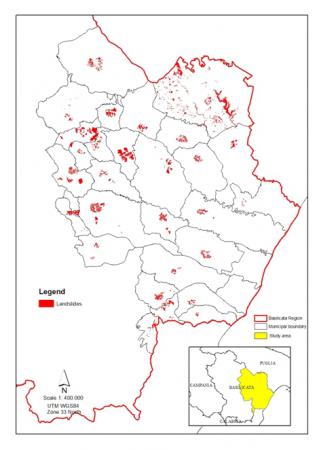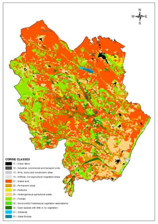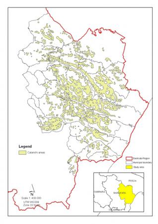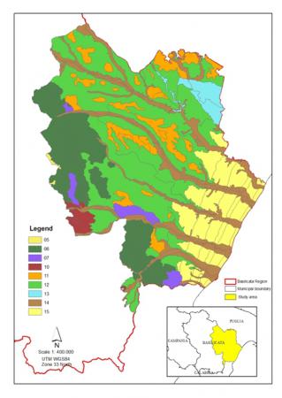 The study area includes several natural reserves including 13 Sites of Community interest and the Pollino National Park. The dominant land cover classes are arable land (47%), forests (16%), heterogeneous agricultural areas (16%), permanent crops (7%), shrub (6%) and pastures (2%). A significant part of Matera (68,444 ha) is covered by the calanchi badlands a typical Matera landscape, with different degrees of erosion starting from simple laminar erosion to the "biancane", small rounded residual hills. Calanchia areas are the result of typical erosion form distributed in the Italian Apennines.